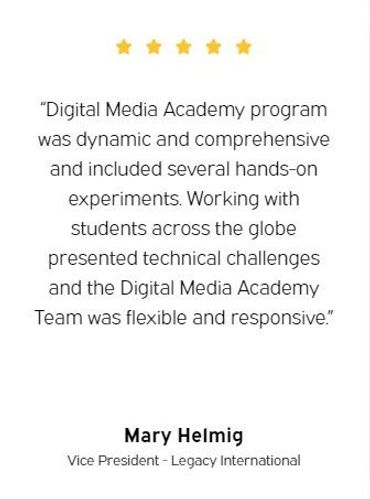 Digital Media Academy was founded in 1999 on the campus of Stanford University to provide technology education to K12 teachers and develop technology immersion courses for students. In 2002, the Academy for New Media became Digital Media Academy and greatly expanded its technology education programs and operated in the most prestigious universities: Stanford University, Oxford University, NYU, UPenn, U Chicago, U Washington, UCLA, UC San Diego, UBC, U Toronto, and others. Since then, Digital Media Academy has delivered applied technology education to over 500,000+ students in 1,100+ schools in 125+ countries online and in-person.